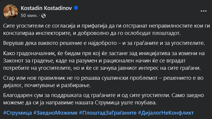 Плоштадот останува чист, сите угостители од Струмица ќе ги отстранат неправилностите, објави на Фејсбук, градоначалникот на Струмица, Костадин Костадинов.