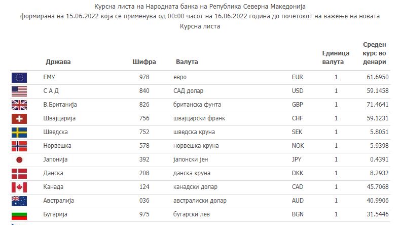 Според средната курсна листа на НБРСМ, еврото денеска изнесува 61.6950 денари, а американскиот долар чини 59.1458 денари. Британската фунта изнесува 71.4641 денари.