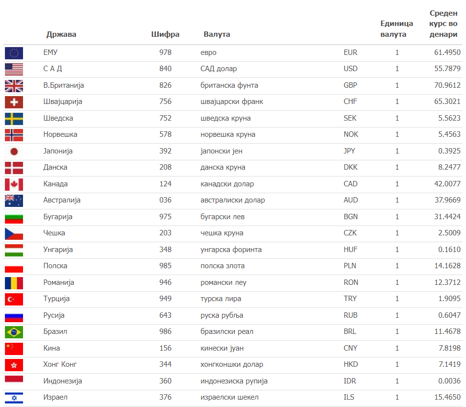 Според курсната листа на НБРМ средниот курс на еврото денеска изнесува 61.4950 денари, а на американскиот долар 55.7879 денари.Средниот курс на британската фунта изнесува 70.9612 денари.