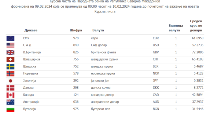 Според курсната листа на НБРМ средниот курс на еврото денеска изнесува 61.6950 денари, а на американскиот долар 57.2735 денари. Средниот курс на британската фунта изнесува 72.2086 денари.
