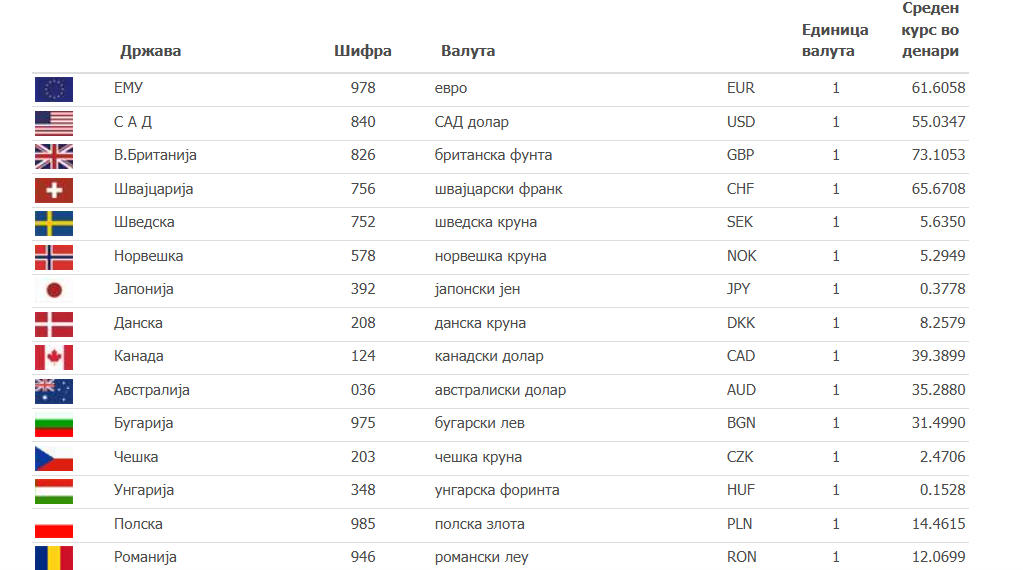 Според курсната листа на НБРМ средниот курс на еврото денеска изнесува 61.6058 денари, а на американскиот долар 55.03474 денари. Средниот курс на британската фунта изнесува 73.1053 денари.
