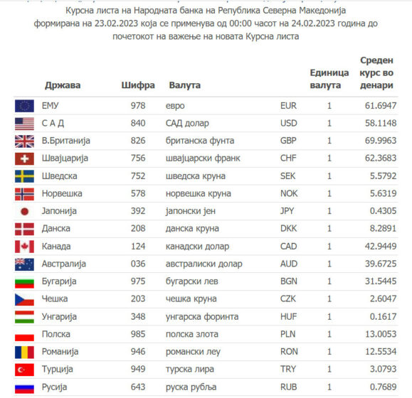 Според курсната листа на НБРМ, средниот курс на еврото денеска изнесува 61.6947 денари, а на американскиот долар 58.1148 денари. Средниот курс на британската фунта изнесува 69.9963 денари.