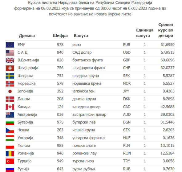 Според курсната листа на НБРМ, средниот курс на еврото денеска изнесува 61.6950 денари, а на американскиот долар 57.9513 денари. Средниот курс на британската фунта изнесува 69.6096 денари.