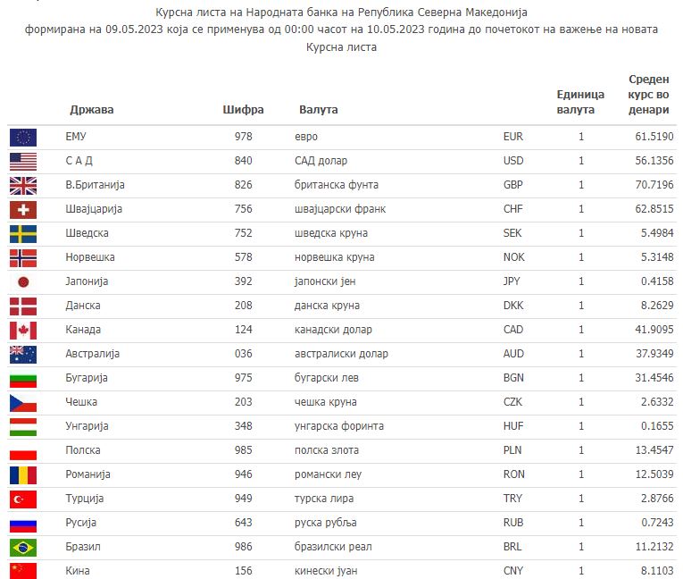 Според курсната листа на НБРМ средниот курс на еврото денеска изнесува 61.5190 денари, а на американскиот долар 56.1356 денари. Средниот курс на британската фунта изнесува 70.7196 денари.