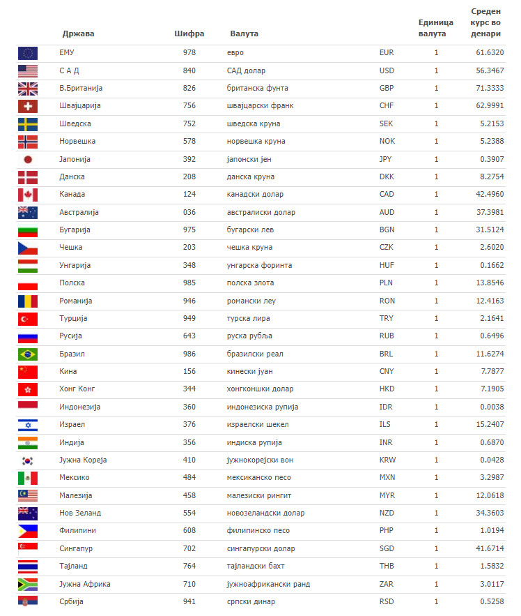 Според курсната листа на НБРМ средниот курс на еврото денеска изнесува 61.6320 денари, а на американскиот долар 56.3467 денари. Средниот курс на британската фунта изнесува 71.3333 денари.
