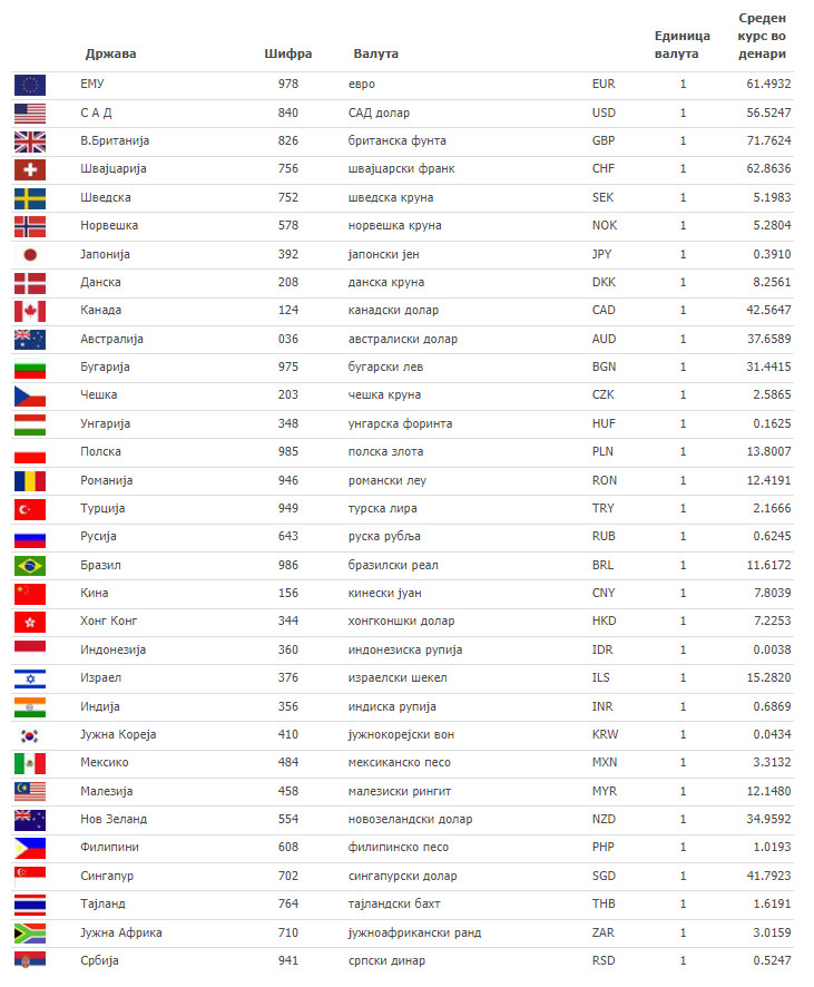 Според курсната листа на НБРМ средниот курс на еврото денеска изнесува 61.4932 денари, а на американскиот долар 56.5247 денари. Средниот курс на британската фунта изнесува 71.7624 денари.