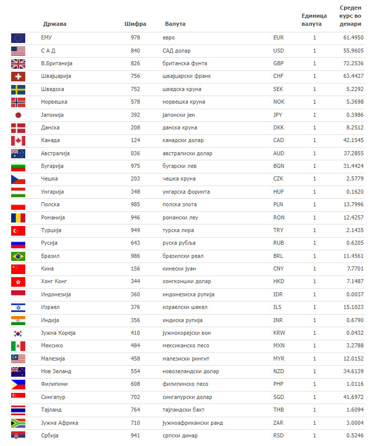Според курсната листа на НБРМ средниот курс на еврото денеска изнесува 61.4950 денари, а на американскиот долар 55.9605 денари. Средниот курс на британската фунта изнесува 72.2536 денари.