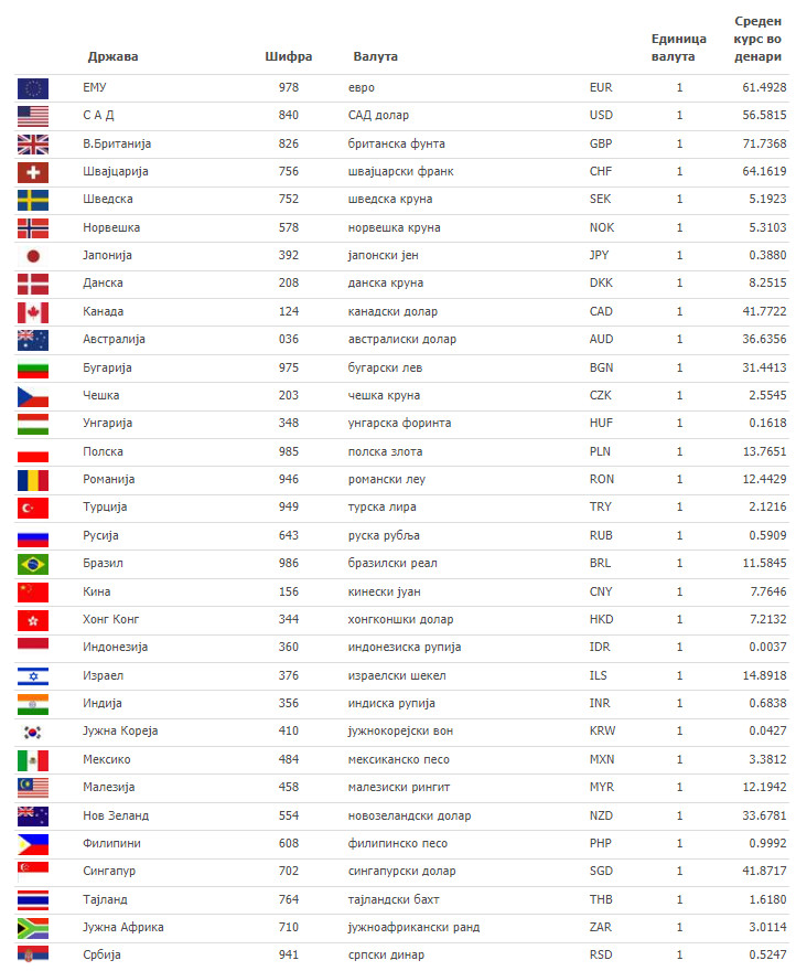 Според курсната листа на НБРМ средниот курс на еврото денеска изнесува 61.4928 денари, а на американскиот долар 56.5815 денари. Средниот курс на британската фунта изнесува 71.7368 денари.
