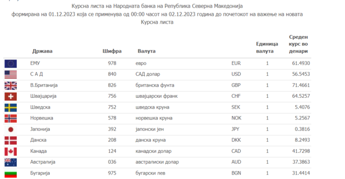 Според курсната листа на НБРМ средниот курс на еврото денеска изнесува 61.4930 денари, а на американскиот долар 56.5453 денари. Средниот курс на британската фунта изнесува 71.461 денари.
