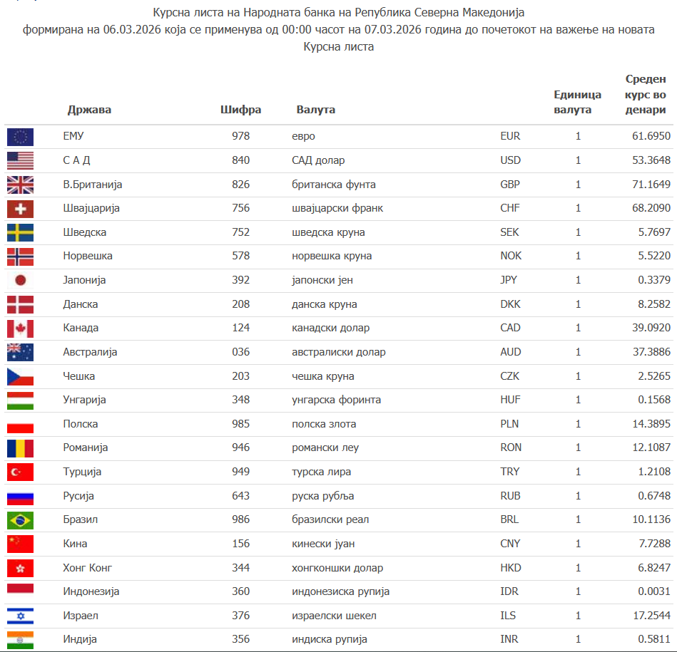 Според курсната листа на Народната банка средниот курс на еврото денеска изнесува 61.6950 денари, а на американскиот долар 53.3648 денари. Средниот курс на британската фунта изнесува 71.1649 денари.