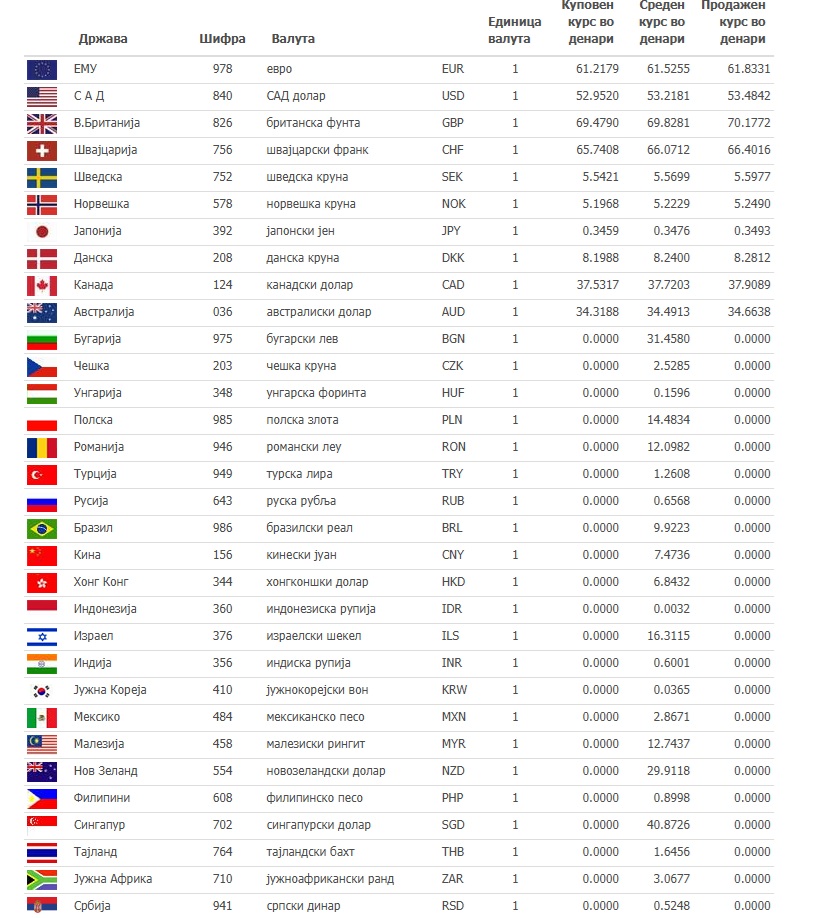 Според курсната листа на НБРСМ средниот курс на еврото денеска изнесува 61.5255 денари, а на американскиот долар 53.2181 денари. Средниот курс на британската фунта изнесува 69.8281 денари.