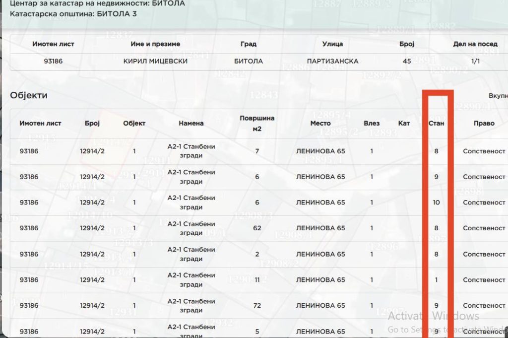 Според имотните листови кои се споделени за јавноста, на Улица “Ленинова 65” – во строгиот центар на градот – поседува цел спрат од зграда со повеќе станови со симптоматично поделени квадрати, каде цената достигнува 2000 евра по м².