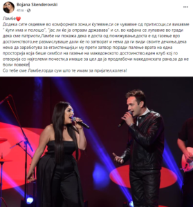 Еден клуб кој го отворија со најголеми почести,а имаше за цел да ја продлабочи македонската рана,за да не боли повеќе! Со тебе сме Ламбе,горда сум што те имам за пријател,колега!“