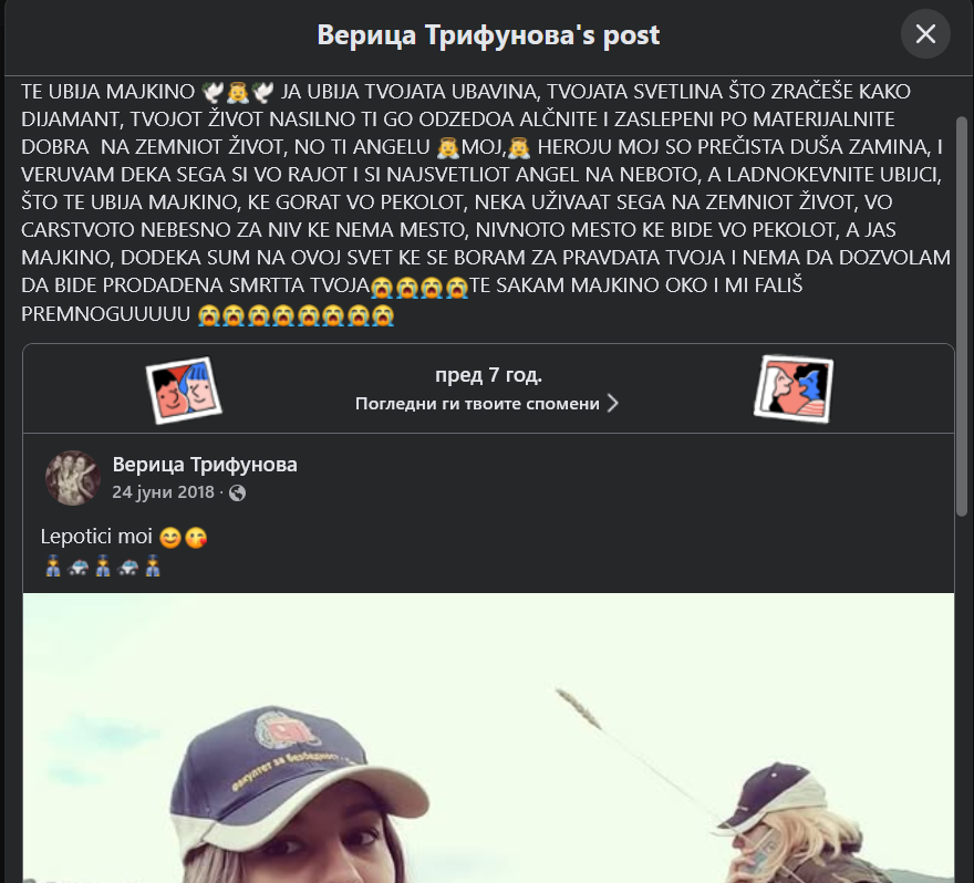 „Ладнокрвните убијци што те убија мајкино – ќе горат во пеколот. Нека уживаат сега во земниот живот, но во царството небесно за нив нема место. Додека сум жива – ќе се борам за твојата правда. Нема да дозволам твојата смрт да биде продадена“ – пишува Верица.