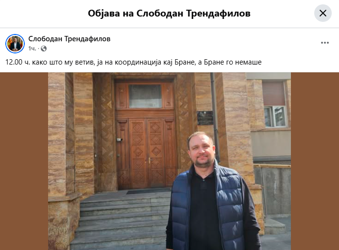 – 12.00 ч. како што му ветив, ја на координација кај Бране, а Бране го немаше – напиша Трендафилов на Фејсбук.