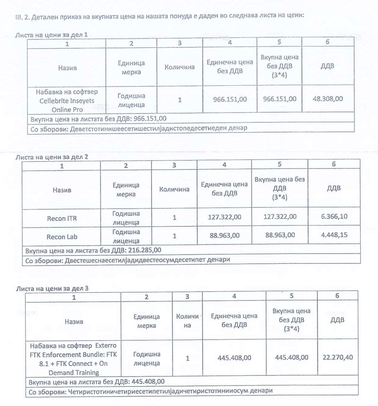 МВР набавува годишна лиценца за софтвер Cellebrite Inseyets Online Pro, годишна лиценца за Recon ITR, Recon Lab, Exterro FTK Enforcement Bundle. Цените можете да ги видите во продолжение.