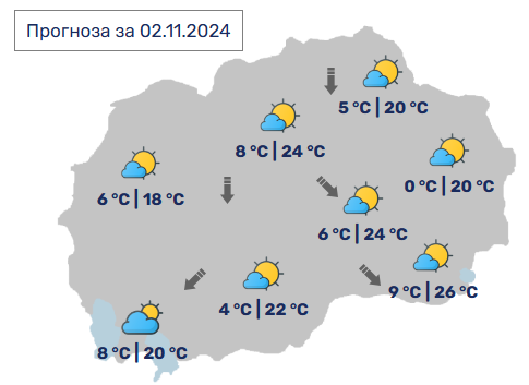 Во Скопје наутро во делови од котлината ќе има услови за појава на слаба магла, а преку денот сончево со мала до умерена облачност. Ќе дува слаб до умерен ветер од северен правец кој во делови од котлината повремено ќе засилува.