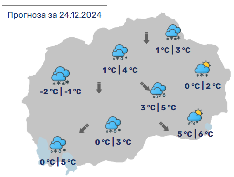 Во Скопје, претежно облачно и студено со повремен слаб дожд, а во повисоките делови од котлината од дожд и слаб снег. Ќе дува умерен ветер од северен правец.