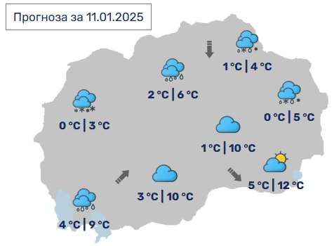 Во Скопје претежно облачно со повремен слаб дожд, а во текот на ноќта од дожд и снег. Ќе дува умерен ветер од северен правец.