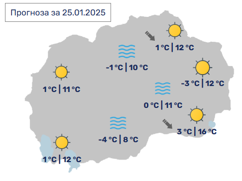 Од УХМР јавуваат дека времето денеска ќе биде претпладне со појава на магла по одделни котлини. Преку денот сончево со мала до умерена локална облачност. Ќе дува слаб ветер од северозападен правец.