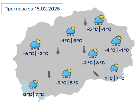 Во Скопје променливо облачно со повремен слаб снег. Ќе дува умерен, а кон крајот на денот и во текот на ноќта засилен северен ветер.