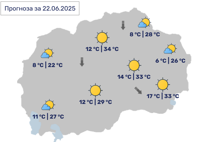 Максималната температура ќе изнесува 34 степени Целзиусови, а најтопло ќе биде во Скопје.