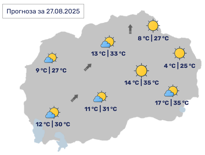 Од УХМР јавуваат дека времето денеска ќе биде сончево и потопло со мала до умерена облачност. Ќе дува слаб до умерен ветер претежно од југозападен правец.