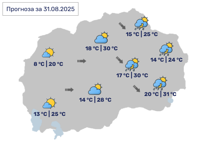 Од УХМР јавуваат дека времето денеска ќе биде променливо облачно, претпладне со локален дожд и грмежи претежно во источните делови. Ќе дува умерен повремено засилен западен, а во источните делови северозападен ветер.