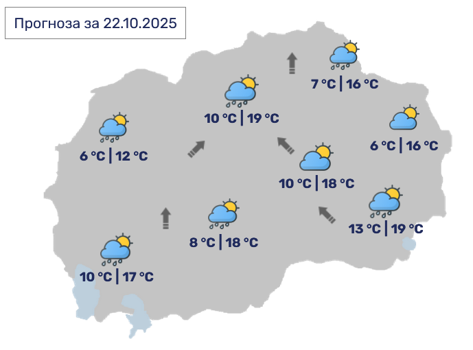 Од УХМР јавуваат дека времето денеска ќе биде променливо облачно со повремени локални врнежи од дожд. Ќе дува слаб до умерен ветер од југоисточен правец.