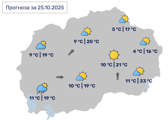 Од УХМР јавуваат дека времето денеска ќе биде променливо облачно со сончеви периоди освен во крајните југозападни делови каде има услови за слаб локален дожд. Ќе дува умерен, во западните делови наместа повремено засилен ветер од западен и југозападен правец.