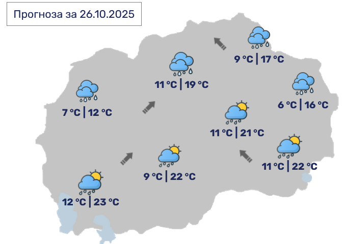 Од УХМР јавуваат дека вроменливо облачно со повремени локални врнежи од дожд, најпрвин во западните делови каде ќе бидат пообилни и поројни со услови за појава на грмежи. Ќе дува умерен југоисточен, а во западните делови повремено засилен ветер од југозападен правец.