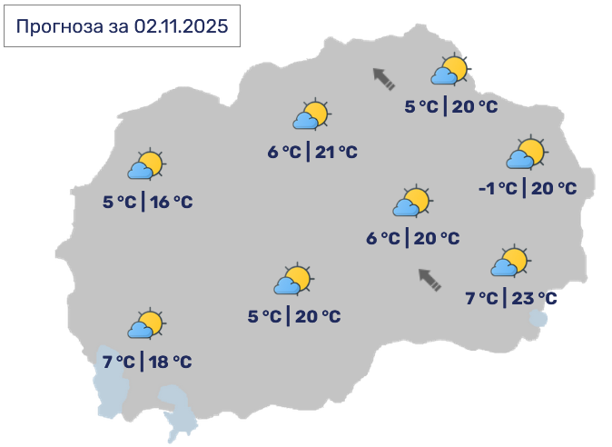 Во Скопје, претпладне во делови од котлината со слаба маглa. Преку денот ќе биде сончево со мала до умерена облачност. Ќе дува слаб ветер од југоисточен правец.