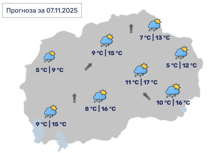 Под влијание на серија влажни воздушни бранови од вчера во вечерните часови до понеделник (10.11.) следува период на променливо облачно време со повремени локални врнежи од дожд. Наместа повремено врнежите ќе бидат поројни и пообилни со услови за појава на грмежи. Во текот на 24 часа се очекува да наврне поголема количина дожд (над 30 l/m²). Од вторник ќе има стабилизирање на времето.
