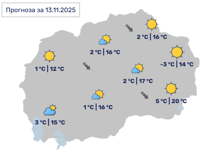 Од УХМР јавуваат дека времето денес ќе биде наутро ведро и студено, а во текот на денот сончево со мала до умерена локална облачност. Ќе дува слаб ветер од северозападен правец.