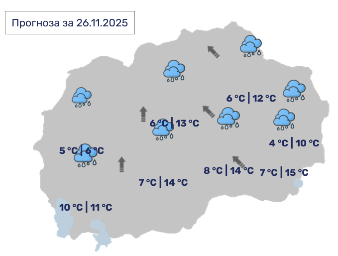 Под влијание на циклонска активност од денес (26.11.2015г) до сабота (29.11.2025г) ќе преовладува претежно облачно време со повремени врнежи од дожд. Пообилни врнежи се очекуваат во текот на утрешниот ден и во четврток (над 25 l/m2 за 24 часа). Поради спуштање на постудена воздушна маса од север, во четврток на планините врнежите ќе преминуваат во снег, а дневните температури ќе опаднат за 4-6 степени во споредба со утрешните.