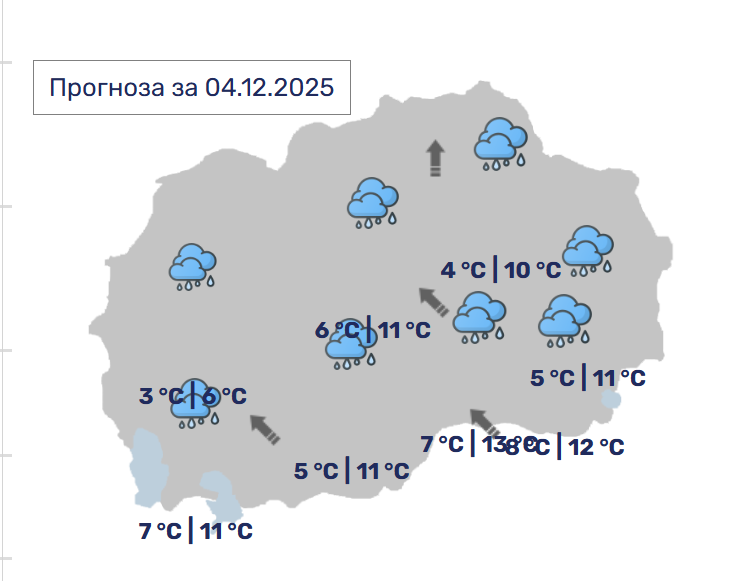 Од УХМР известуваат дека времето денеска ќе биде облачно со повремени врнежи од дожд, пообилни во југоисточните делови (локално над 30 l/m² за 24 часа).
