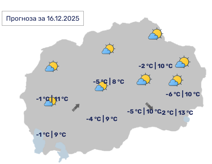 Од УХМР јавуваат дека времето денеска ќе биде во утринските и претпладневните часови по одделни котлини ќе има појава на магла. Во текот на денот времето ќе биде сончево со мала до умерена локална облачност. Ќе дува слаб променлив ветер.