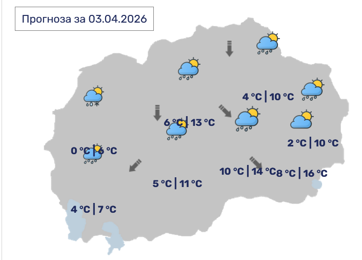 Променливо облачно со повремени локални врнежи од дожд, а на планините и на некои од повисоките места од дожд и снег со послаб интензитет. Ќе дува слаб до умерен, а наместа долж Повардарието повремено засилен ветер од северозападен правец.