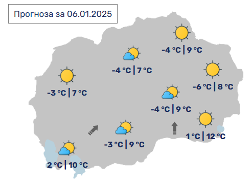 Од УХМР јавуваат деја времето денеска ќе биде наутро студено со појава на магла и ниска облачност по одделни котлини. Преку денот сончево со мала до умерена локална облачност. Ќе дува слаб до умерен ветер од јужен правец.