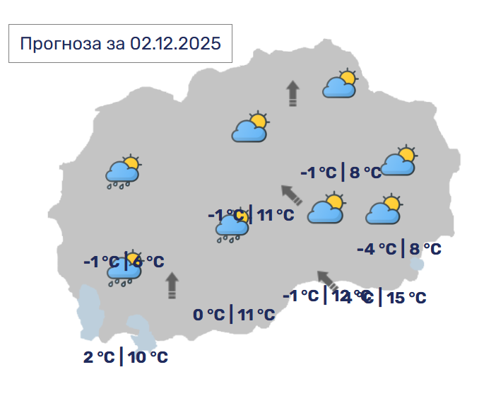 Кон крајот на денот и во текот на ноќта ќе има повремени локални врнежи од дожд. Ќе дува слаб до умерен ветер од југоисточен правец.