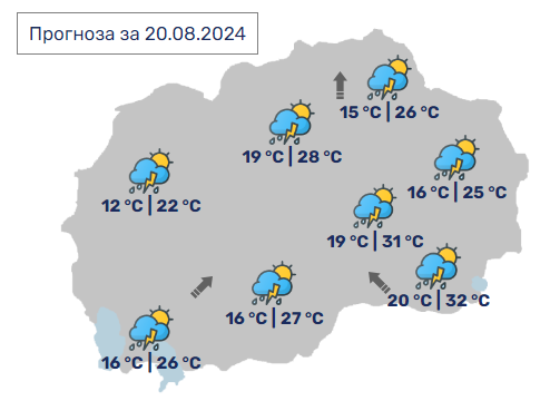 Од УХМР јавуваат дека времето денеска ќе биде променливо облачно и нестабилно, на повеќе места со пороен дожд и грмежи. Локално процесите ќе бидат во форма на невреме со интензивен пороен дожд (над 20 л/м2), силен ветер и појава на град. УВ=6