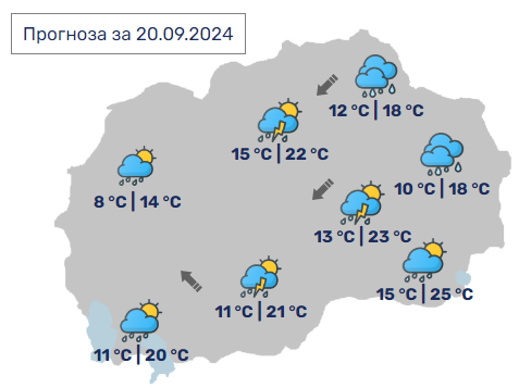 Од УХМР јавуваат дека времето денеска ќе биде променливо облачно со повремени врнежи од дожд, кои наместа ќе бидат пообилни и поројни, проследени со појава на грмежи. Ќе дува слаб до умерен ветер претежно од североисточен правец.