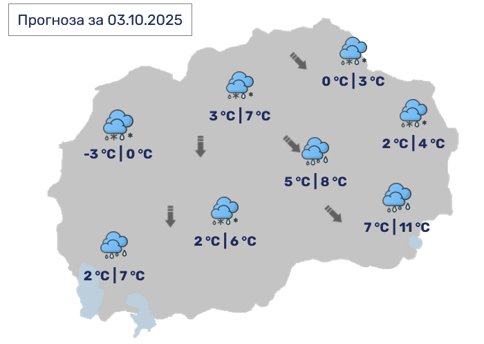 Во Скопје, облачно и студено со врнежи од дожд, а на повисоките места од котлината со повремени врнежи од дожд и снег. Ќе дува засилен ветер од северен правец.