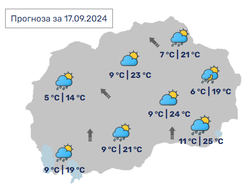 Од УХМР јавуваат дека времето денеска ќе биде променливо облачно со сончеви периоди. Попладне ќе има локални врнежи од дожд и ретки грмежи. Ќе дува слаб до умерен ветер од јужен и југоисточен правец.
