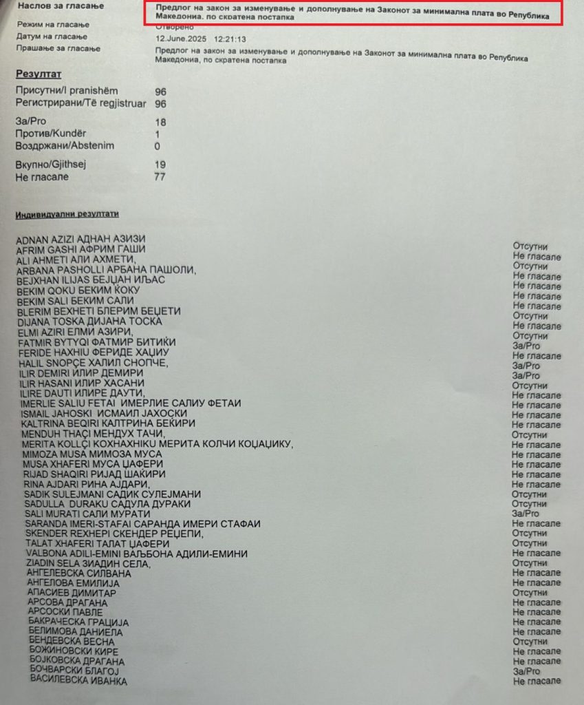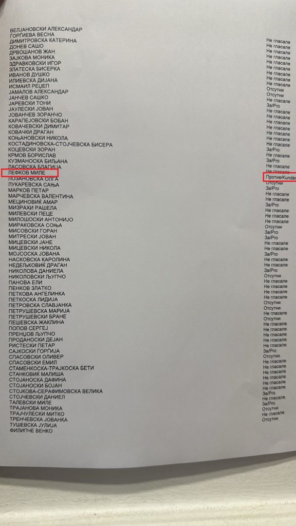 „За“ предлогот гласаа пратениците на СДСМ и Левица, не гласаа или беа воздржани пратениците на ВМРО-ДПМНЕ, со исклучок на Миле Лефков кој гласаше против.