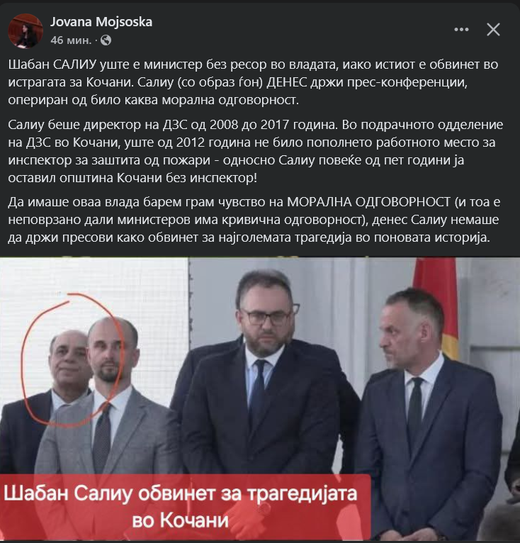 – Шабан САЛИУ уште е министер без ресор во владата, иако истиот е обвинет во истрагата за Кочани. Салиу (со образ ѓон) ДЕНЕС држи прес-конференции, опериран од било каква морална одговорност.
