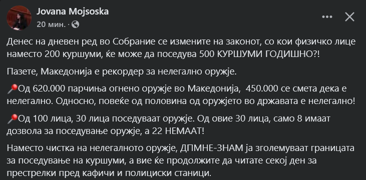 Наместо чистка на нелегалното оружје, ДПМНЕ-ЗНАМ ја зголемуваат границата за поседување на куршуми, а вие ќе продолжите да читате секој ден за престрелки пред кафичи и полициски станици. – напиша Мојсоска на Фејсбук.