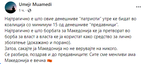 Денешните патриоти утре ќе бидат во коалиција со минимум 15 денешни предавници, пишува на Фејсбук Умејр Муамеди.