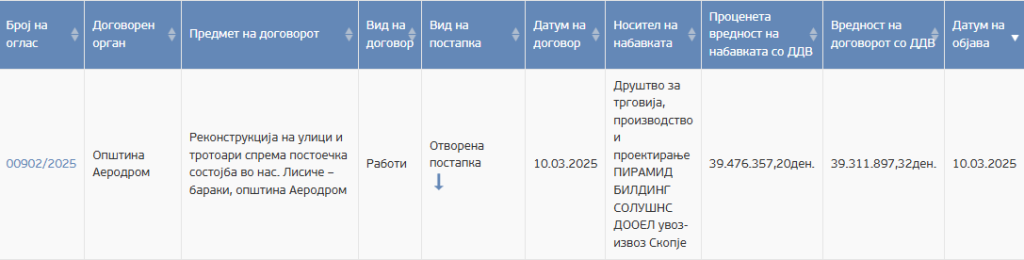 Како што можете да видите од податоците во продолжение, целата набавка е 39,3 милиони денари. Договорот е потпишан од наследникот на Муцунски на позицијата градоначалник на Аеродром, Дејан Митевски.