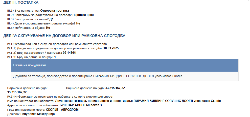 Нови 39 милиони денари ќе завршат во џебот на ПИРАМИД БИЛДИНГ, компанијата која ја гради и настрешницата во МНР за неверојатни половина милијарда денари.